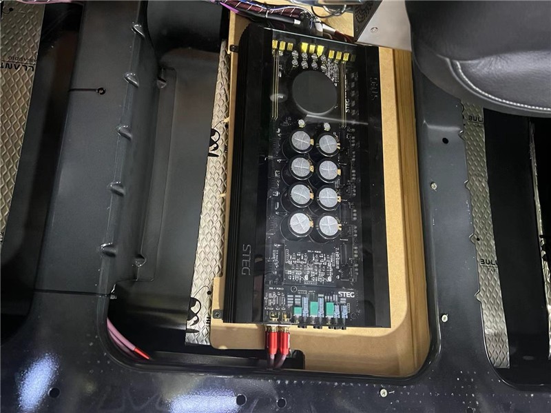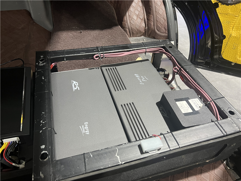 一台德国RS能量4路功放、一台史泰格4路功放,再搭配RS低音功放。所有的功放与阿尔派X120-8音频处理器一起,都被巧妙地隐藏式安装在座椅下方。这样的设计既保证了设备的安全与散热,又完全不占用车厢的宝贵空间。