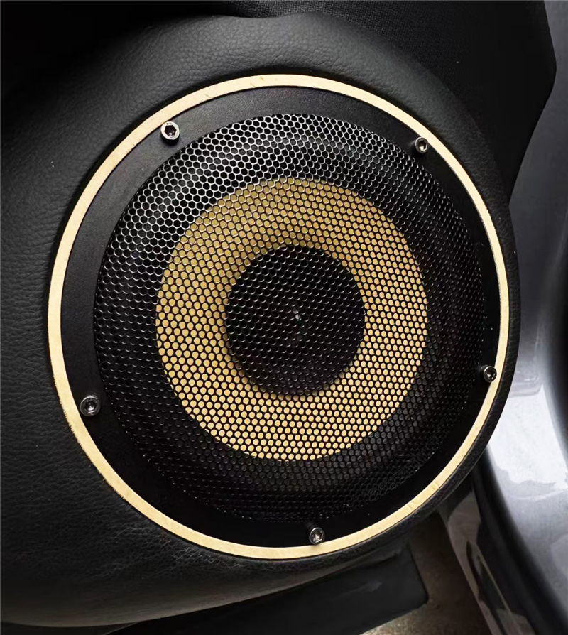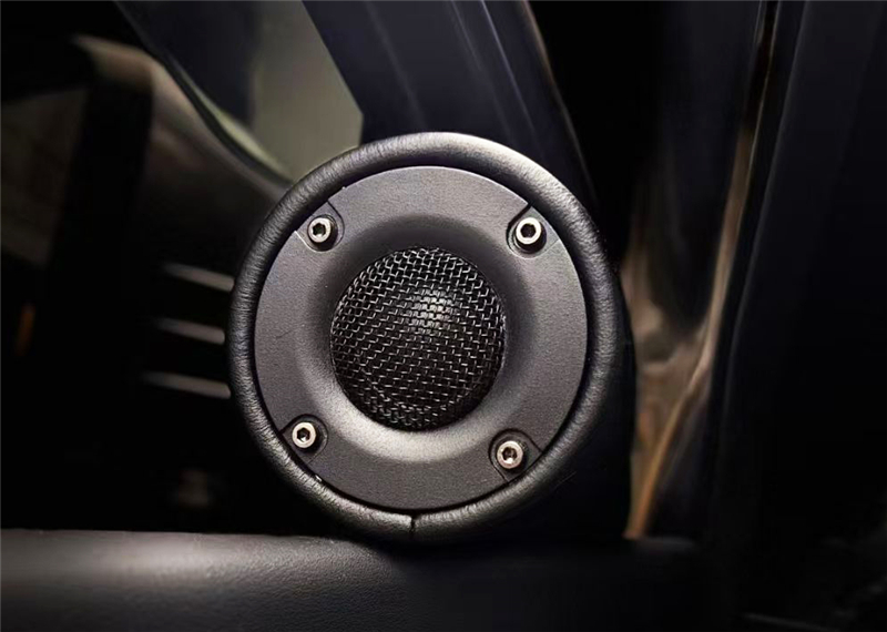 前声场的四分频,是由妃仕PFD三分频套装外加一对超高音单元组合而成,所有喇叭单元都是倒模安装。其中超高音与中音单元通过精准倒模置于A柱,拓宽了声场宽度与高度;高音单元倒模于门板三角位,优化了指向性。