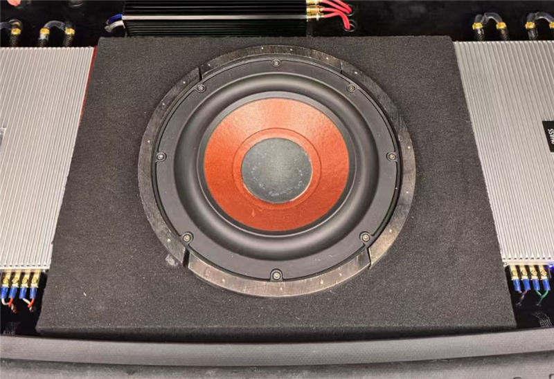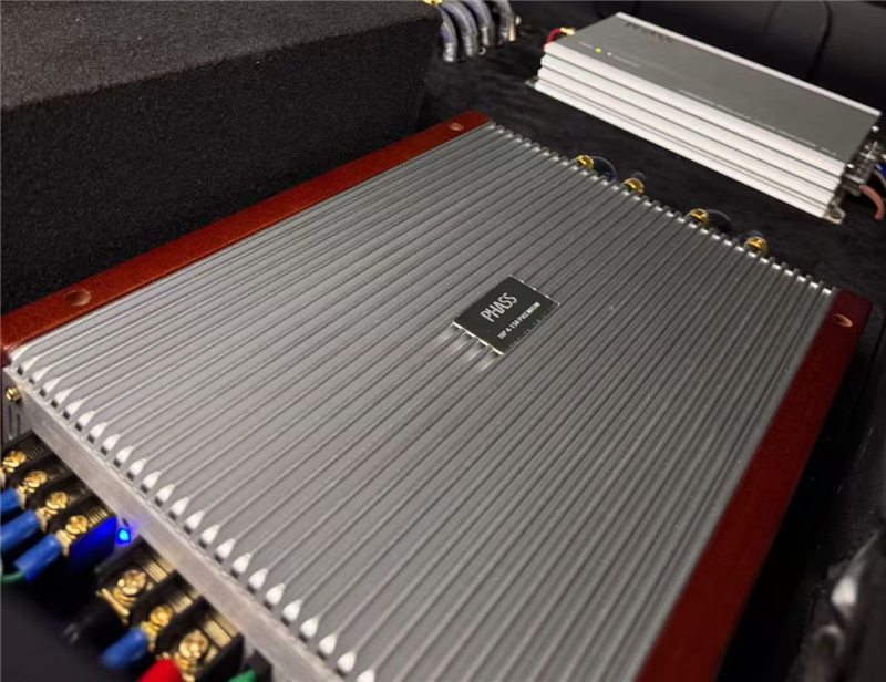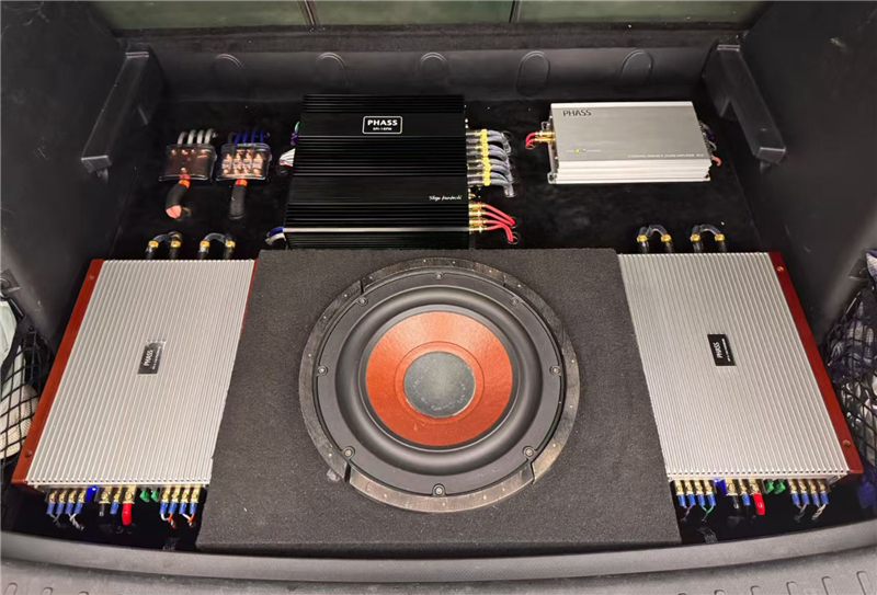 补充低频下潜的是一只妃仕P270EP超低音喇叭,定制的低音木箱安装在尾箱底板之下。此外,在低音喇叭旁边有序摆放着妃仕SPI-16PM DSP处理器,两台妃仕HP4.150四路功放和妃仕PI-2功放。器材都是隐藏安装,盖上盖板就完全不会影响尾箱的储物功能。