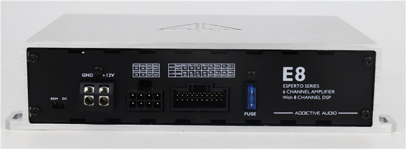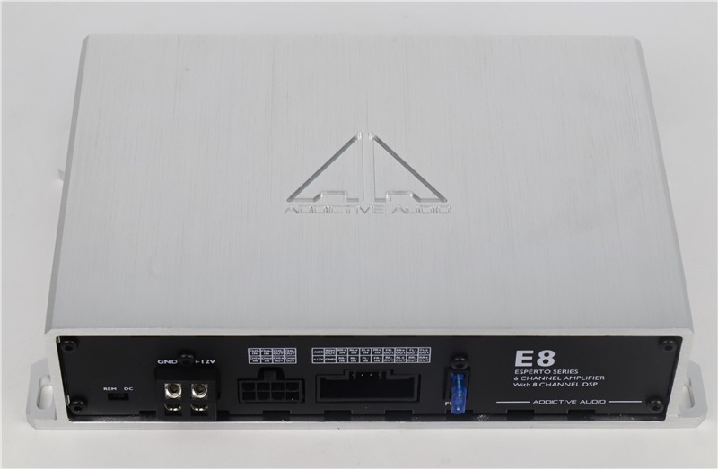 在接口布局上,E8体现了高度的实用主义,采用对出接线设计,一侧配备高电平六进六出连接端口,完美适配原车音响系统;电源端口经过镀银工艺处理,有效降低电阻,确保电流传输更为迅捷稳定。