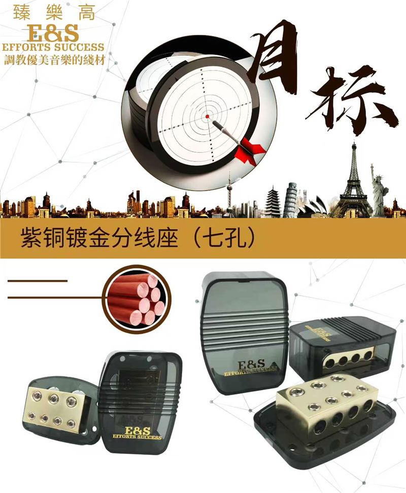 总而言之,E&S臻乐高ESE-104紫铜镀金七孔分线座,让电源分配环节的更可靠、更安全,为音质的提升再加一层保障,是资深玩家与专业技师在构建顶级汽车音响系统时不可或缺的精品配件。