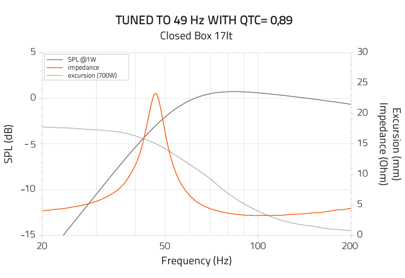 老炮根据赫兹官方的T/S参数,ML 2500.3总Qts值为0.63,谐振频率Fs在33Hz左右,Vas等效容积为23.5L。高Q值低fs,这样的喇叭单元明显是密闭箱优先的设计。我用Bassbox进行验证:低频速度快,力度感强又兼顾下潜,密闭箱的最小容积只要17L,填充好吸音棉,低频下限(-6dB)可以到达35Hz左右,45Hz以上最大声压轻松超过110dB。为什么车载不需要更低的低频?其实和车厢环境相关。这样的设计可以说是非常理想的车用方案,占用空间极小,且瞬态响应干净利落。如果能做到25L左右的箱体容积,低频听感会更松软,但要注意了,低频下限更低,需要你在DSP或功放上将次低频20Hz以下衰减以防止车厢共振明显,因为ML 2500.3的能量太大了。