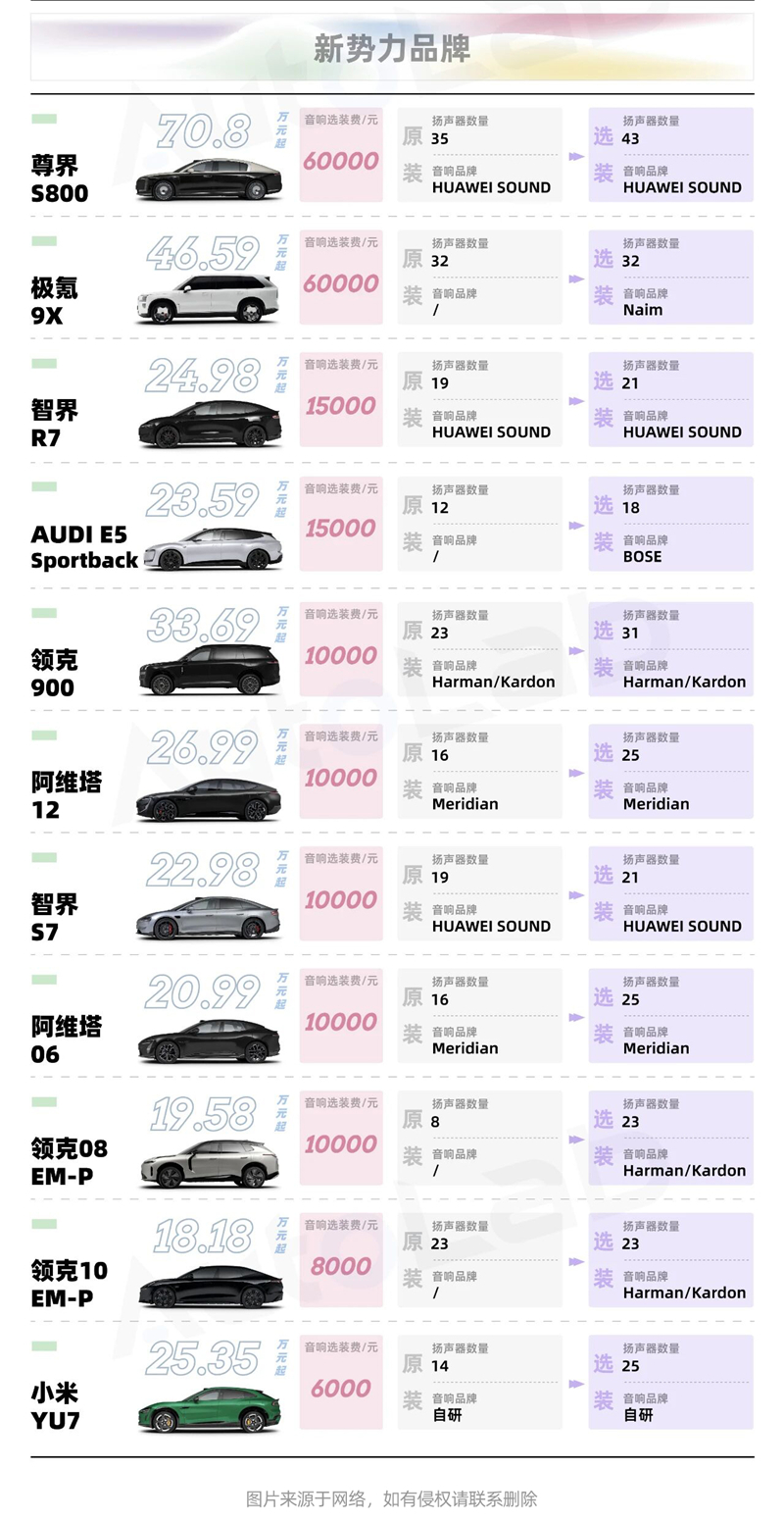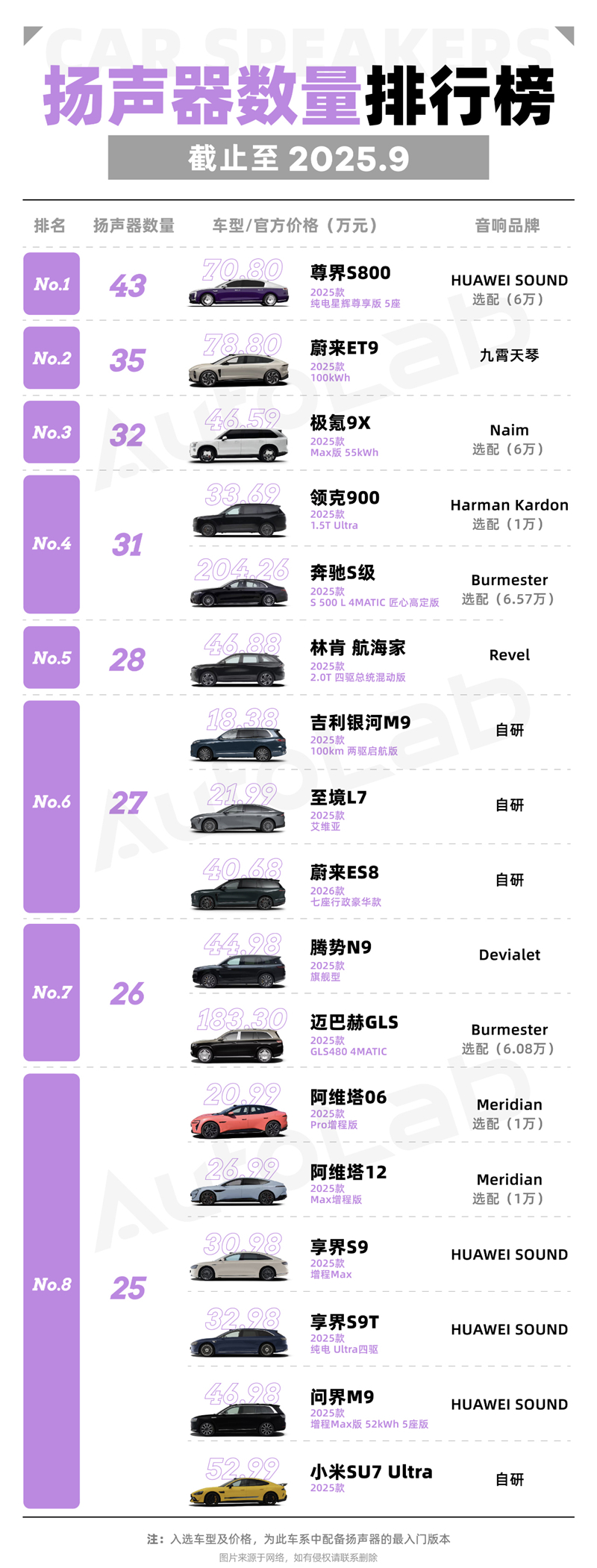 以前,能上10个喇叭的基本都是高配或豪华车型,所以很多车主甚至在购车前就去改装店咨询试听升级方案,提车后更是直奔改装店,少则上千多则上万的升级音响。而今天,新能源汽车的原车音响配置,最后呈现效果先不说,但喇叭的数量是节节攀升,20多只喇叭已是常规,而像华为尊界S800,最高达到了43只扬声器,这可真是人被喇叭给包围了。