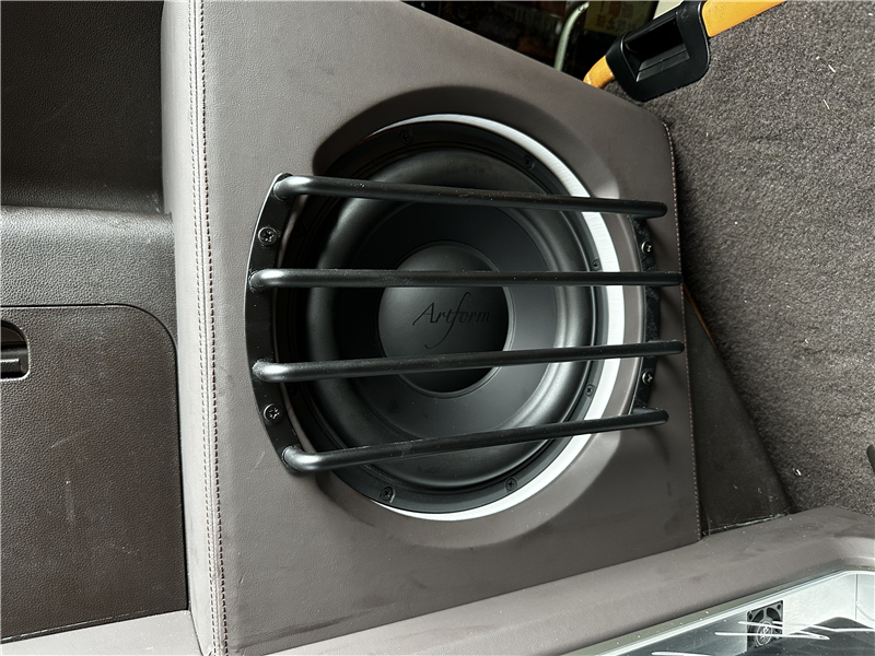 低音系统是雅之峰R10低音喇叭,由一台意大利TEC 1800.1功放来驱动,Q弹又有力道的低音效果,满足车主对于不同风格的音乐听需。根据车型定制的低音箱体,紧靠着后排座椅固定摆放,并且还不会占用太多的尾箱空间。
