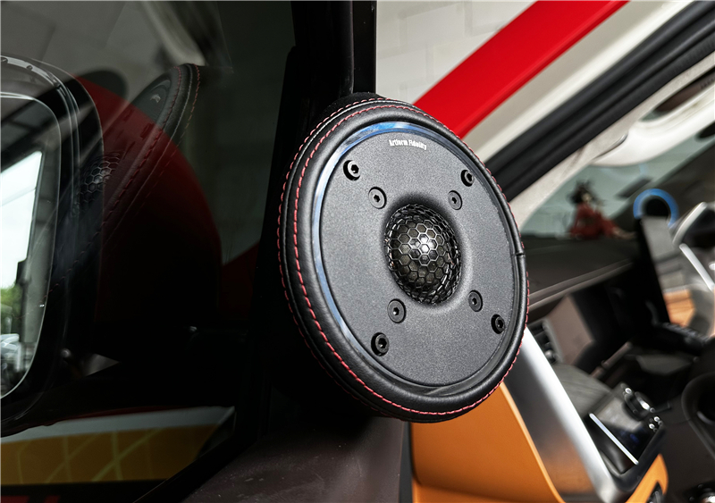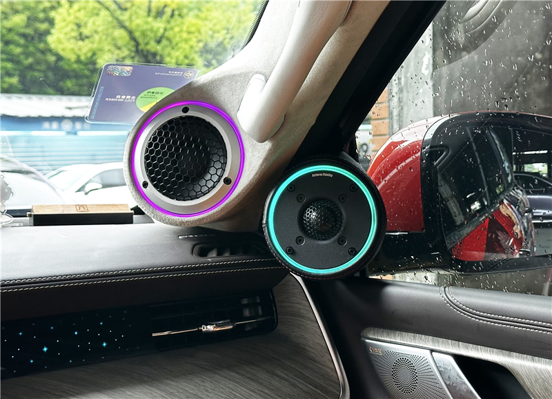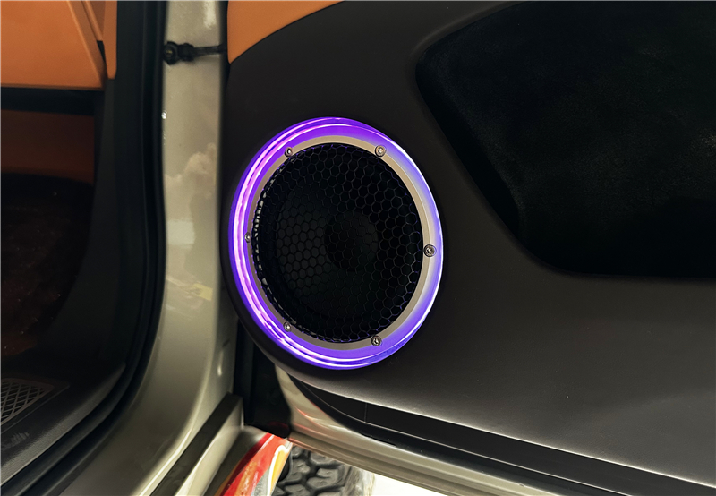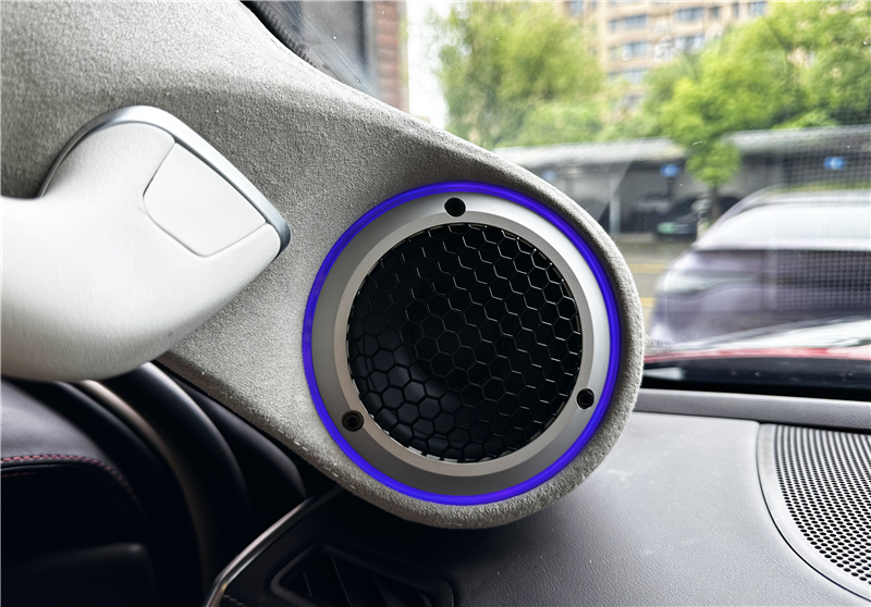 前声场的雅之峰梵高系列三分频喇叭,六只喇叭单元都是倒模安装,高音倒模在三角位,中音A柱倒模,中低音车门倒模安装。此外后门是一套雅之峰R6两分频喇叭,以及中置和后环绕,形成一个7.1全景环绕声音响系统,另外还增加了氛围灯光,音乐开始之后,与尾箱的氛围灯光相互辉映,让整个车厢有更加浓郁的音乐氛围。