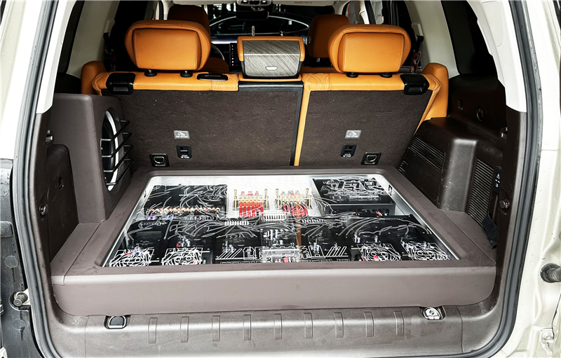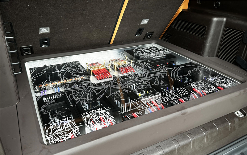 为了每只喇叭都有纯净音质,前声场的三分频以及中置都是由雅之峰单声道功放,一台一路来驱动。后声场由一台雅之峰RA TWO两路功放驱动,以及后环绕功放,此外还有意大利TEC电源管理器和电容,器材比较多,所以尾箱专门制定了一只箱体,分上下两层来安装这些器材,箱体表面是透明的亚克利面板,雕刻着车主喜欢的卡通图案,再搭配炫彩的氛围灯光,非常有二次元炫酷的氛围感。