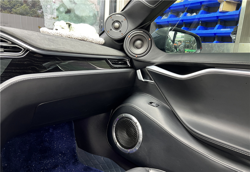 整个前声场三分频的倒模,全是手工真皮包覆,不仅赋予了音响系统高级的视觉与触觉质感,更重要的是,其色调与纹理都与Model S原车内饰风格高度统一,实现了"改装"与"原厂"的完美融合。