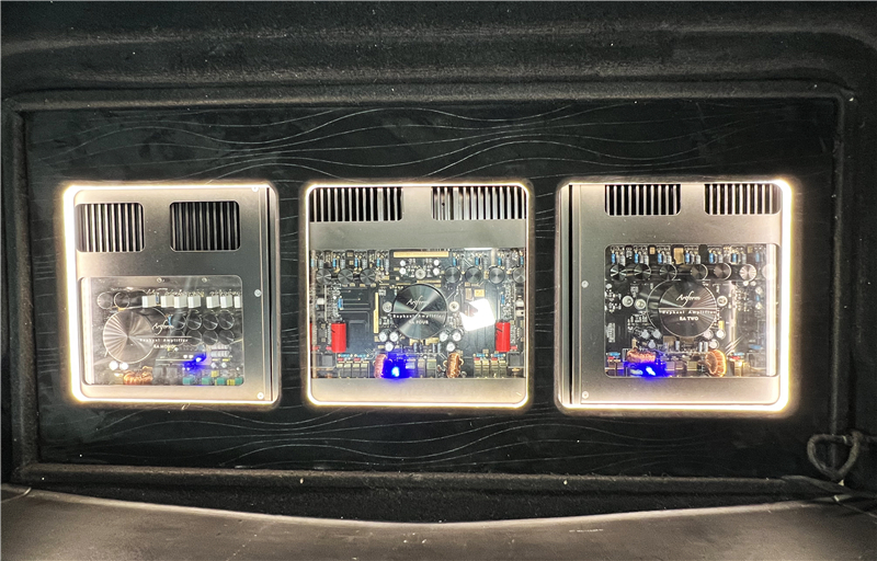 系统的动力核心被巧妙地隐藏在尾箱底板之下。先锋解码器与多台雅之峰纯后级功放,以及保险电容等辅助器材,都分层安装在尾箱底板下定制的箱体内,还加入了微黄的暖调氛围灯,在观感与氛围上都更具魅力,体现了细节处的匠心。